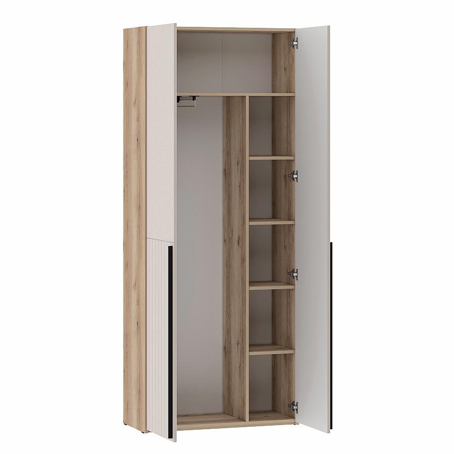 Шкаф двухдверный 200.03 Арден небольшой глубины (40 см), фасад (двери) из МДФ, вертикальные фрезерованные углубления в нижней части дверей создают эффектную игру света и тени, стильная чёрная ручка. Внутри шкафа – торцевая штанга и узкий стеллаж, сверху имеется широкая полка.