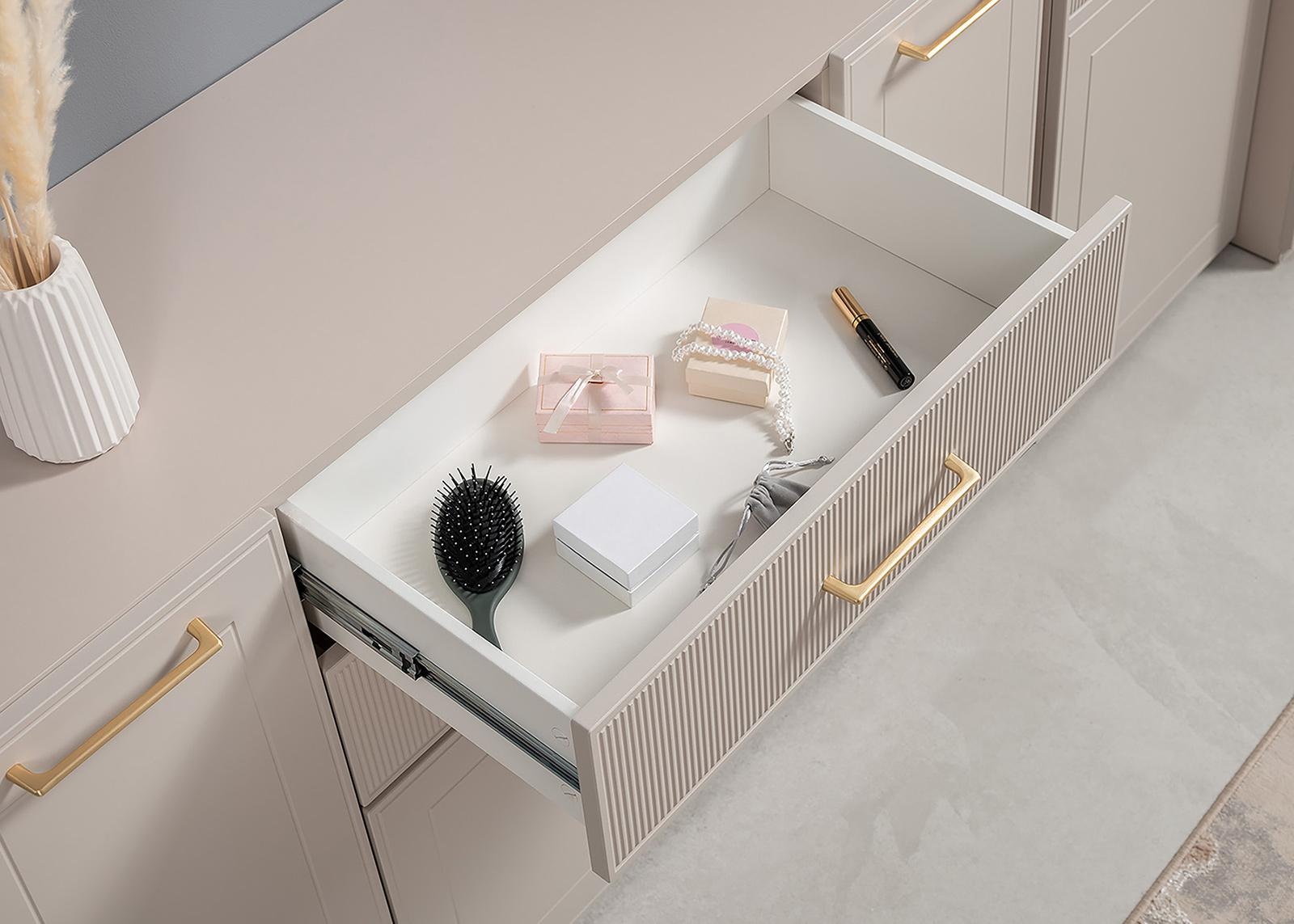 Фасады из МДФ 16 мм в цвете Моно Керамика (матовый, шагрень) с объёмным рисунком и металлическими ручками создают выразительные акценты. Для более премиального восприятия коллекции, к шкафам рекомендуем приобрести карнизы.